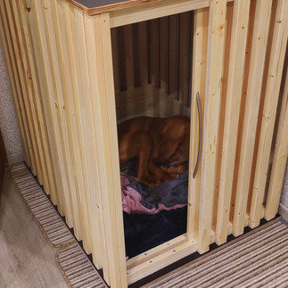 Natürlich darf dann auch nicht ein schönes Bettchen für die Fellnase fehlen. Inspiriert von einigen Fotos habe ich mich für diese Version entschieden. Diese ist sehr komfortabel für unsere Weimaraner Hündin und sie genießt es auch darin zu schlafen. Der Boden und Deckel ist abwaschbar und die Hölzer sind unbehandelt . Werden aber nur leicht mit Olivenöl behandelt um die Oberfläche etwas zu schließen. Maße können nach Wunsch gefertigt werden ! Dieses Muster ist 1 Meter hoch , 1 Meter lang und 80 cm breit. Der Ausgang kann auch individuell angebracht werden.